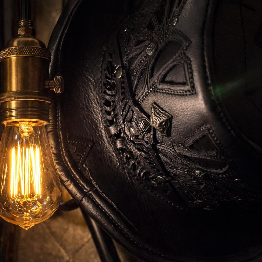 The Daunting & Dapper is our bestselling short top hat — a bold, versatile design crafted from black crocodile‑embossed cowhide layered over durable Black Latigo leather. Intricate filigree engraving, detailed stitching, and tarnished brass hardware give it its signature presence, while the adjustable wire brim and corseted back make it one of our most comfortable and customizable creations.